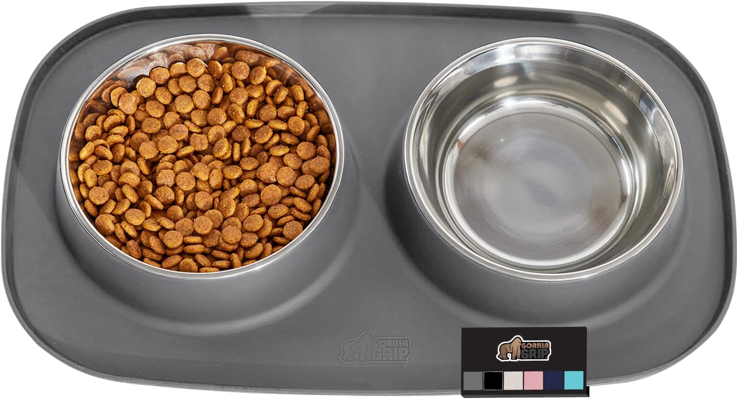 GORILLA GRIP Feeding Mat Set, Patent Pending 100% Waterproof BPA Free Silicone, Stainless Steel Cat and Dog Bowls, Slip Resistant, High Edges Catch Water Food, US Designed Pet Accessories, 1 Cup Gray