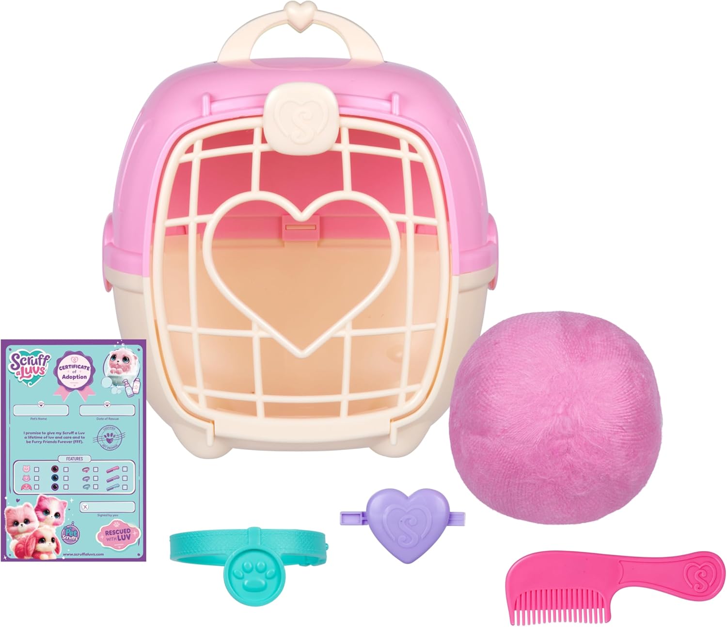 SCRUFFALUVS Pink Surprise Pet, Mystery Plush Toys, Stuffed Animals, Wash to Reveal 1 of 3 Rescue Pets: Puppy, Bunny, or Kitty – Includes 8.7″ Deluxe Pet Carrier – Styles May Vary